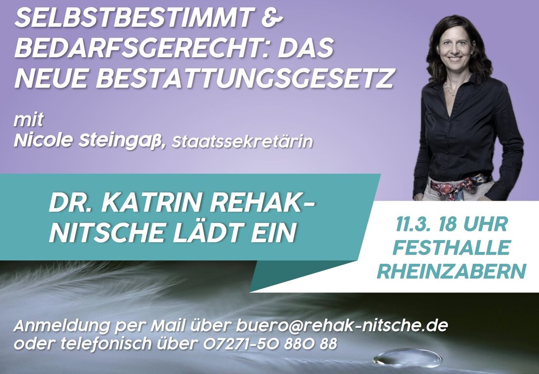 Als Expertin wird Nicole Steingaß, Staatssekretärin, referieren, informieren und mit Ihnen über die Chancen und Herausforderungen des neuen Bestattungsgesetzes für die Bürger, Angehörigen und Kommunen diskutieren. Kommen Sie vorbei und diskutieren Sie mit! Um Anmeldung wird bis zum 06.März 2026 gebeten im Büro der Abgeordneten Dr. Rehak-Nitsche per E-Mail an buero@rehak-nitsche.de oder telefonisch unter 07271-50 880 88. Die Platzkapazitäten des Veranstaltungsraums sind begrenzt.