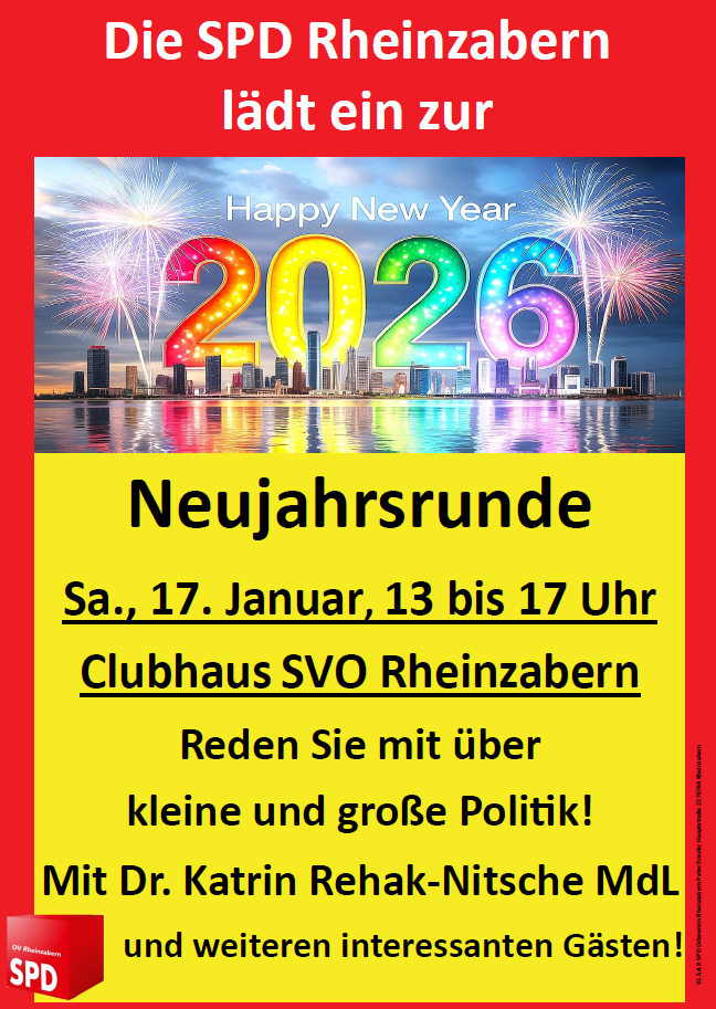 Der SPD-Ortsverein Rheinzabern lädt zum Neujahrstreffen am Samstag, den 17.01.2026, von 13:00 bis 17:00 Uhr. Zu Gast ist die Landtagsabgeordnete Dr. Katrin Rehak-Nitsche, die sich gemeinsam mit der Rheinzaberner SPD auf Diskussion und Austausch mit den Bürgerinnen und Bürgern über die kleine und große Politik freut.